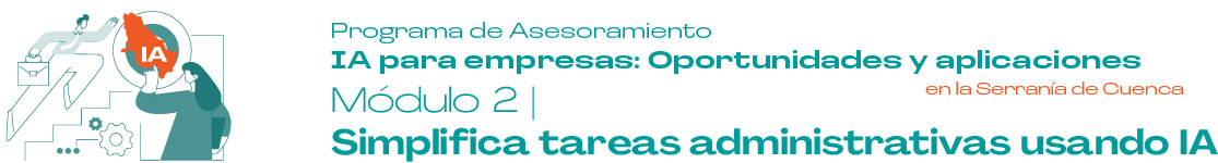 Inicio 5 Programa de Asesoramiento 4 5 Módulo 2: Simplifica tareas administrativas usando IA Volver atrás Módulo 2 Recursos del Módulo Contenido teórico Acceder Podcast Acceder Ejercicio práctico Acceder Lecturas complementarias PCómo Aplicar la IA en tus Tareas Administrativas P8 Procesos que se Pueden Automatizar con IA PImpulsa tu departamento de administración con IA: aumenta eficiencia y reduce costos PEl poder de la IA para impulsar la eficiencia y la satisfacción laboral Vídeos complementarios PCómo usar ChatGPT para redactar: Correos y solicitudes - Curso de ChatGPT P¿Qué es la inteligencia artificial? PConvierte Excel en una Herramienta de IA con ChatGPT